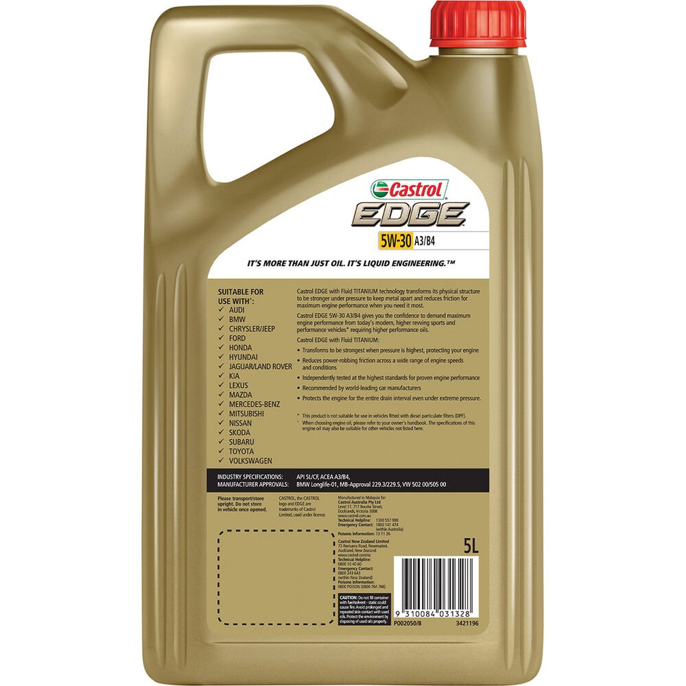 Castrol EDGE 5W-30 A3/B4 is an advanced full synthetic engine oil formulated for highly tuned four cylinder and latest technology engines both naturally aspirated or turbocharged. Formulated with Fluid Titanium Technology, this unique formulation’s adaptive strength reduces metal to metal contact across a range of different driving speeds, lowering friction and maximising engine performance.