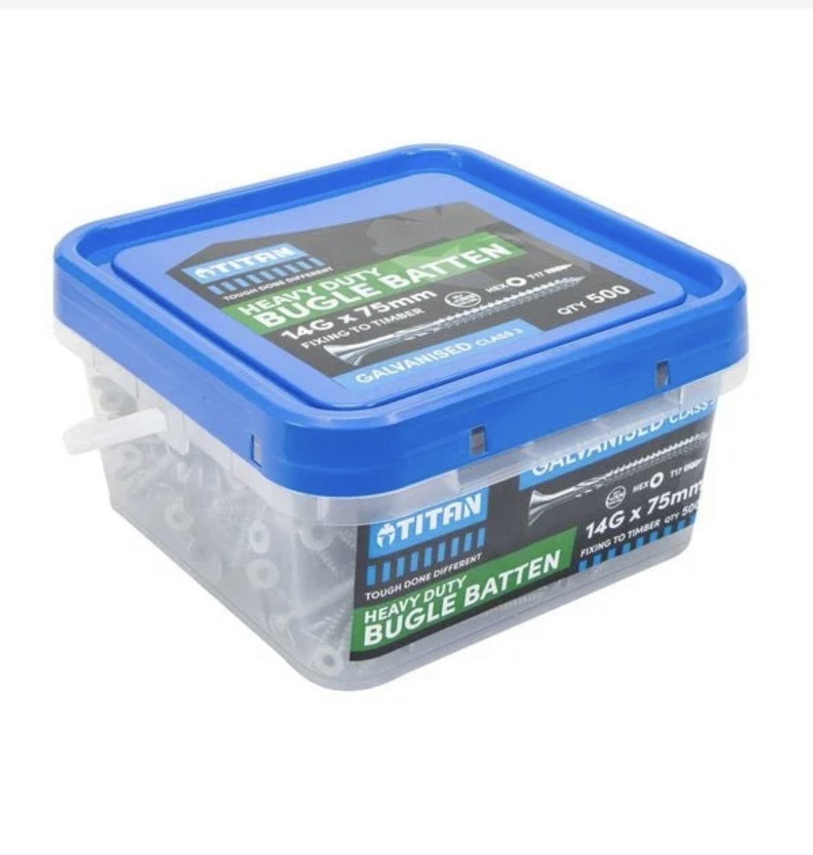 Galvanised Class 3: Suitable for external use Bugle head ensures a flush surface finish 5mm hexagonal drive head and T17 drill point designed for high-torque fastening Knurling reduces timber splitting and reduces torque required to drive the screw into timber. Under head rib design improves drive efficiency and countersinking into timber The Titan Bugle Batten…