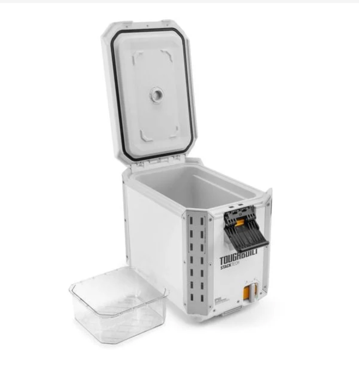 StackTech Compact Cooler is engineered for those who demand performance and durability. It features an intuitive self-aligning top that allows StackTech boxes and coolers to virtually stack themselves. An auto-locking interface ensures the cooler and boxes sit securely, lock into place for transport, and easily unlock with the slide of a switch. A prominent lock indicator lets you know your stack is safe to move without second guessing. Accessing the cooler is simple and intuitive with a one-handed centre latch, standard on the StackTech system. The 15-litre capacity makes it easy to carry and provides plenty of room for your beverages and perishables. Inside the cooler, you’ll find a clear tray/dry goods basket, perfect for separating snacks or personal items from the main compartment. A built-in bottle opener located on the front accessory rail ensures you’re always ready to enjoy your favourite beverages after a tough day. The white color helps to reflect sunlight, reducing heat absorption and keeping the contents cooler for longer. The StackTech Coolers are compatible with the ToughBuilt Ice Pack, TB-B1-A-92 (not included, available 2025), which attaches to the inside of the lid. Full customisation is at everyone’s fingertips with tool-free, quick-release steel accessory rails. The StackTech Compact Cooler is built for high-impact durability with armoured corners and IP65 dust and water protection to ensure it can handle the toughest conditions. The StackTech Compact Cooler is engineered for all to build a system unlike any other and customise it to the needs of every trade.