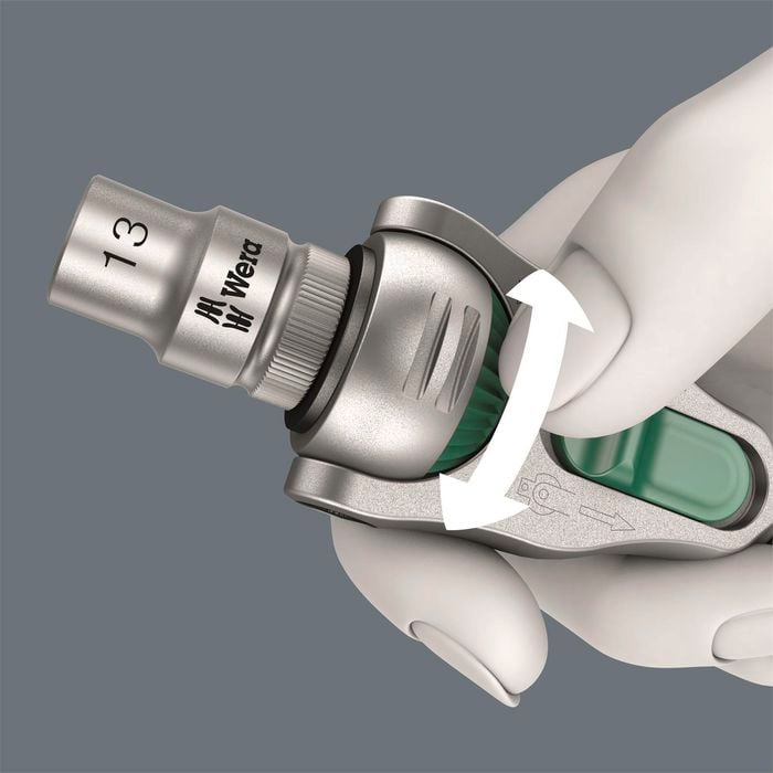 The defined locking at 0°, 15° and 90° to the left and right ensure safe working and prevents any slipping of the ratchet head. Furthermore, the ratchet with adaptor and bit can be used as a conventional screwdriver.